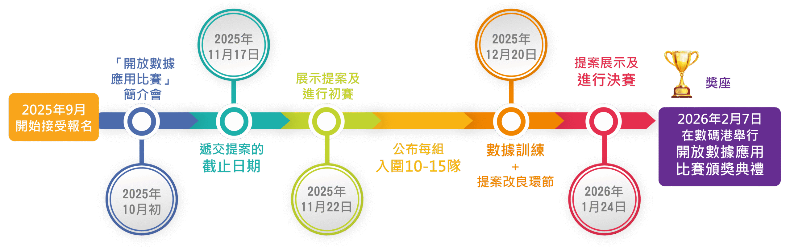 基於2021年以來開放數據應用比賽的成果與影響力,2025年我們繼續舉辦此活動具有充分理由。隨著人工智智慧普及,「智慧經濟」主題既能回應當前現狀,亦能把握未來機遇。聚焦此主題的應用比賽將為社區帶來實質效益,包括: