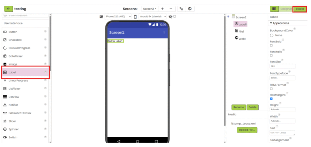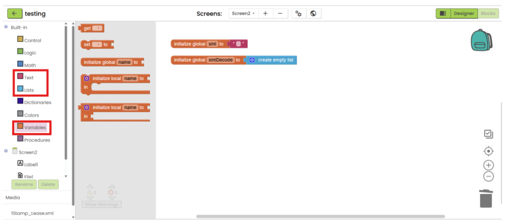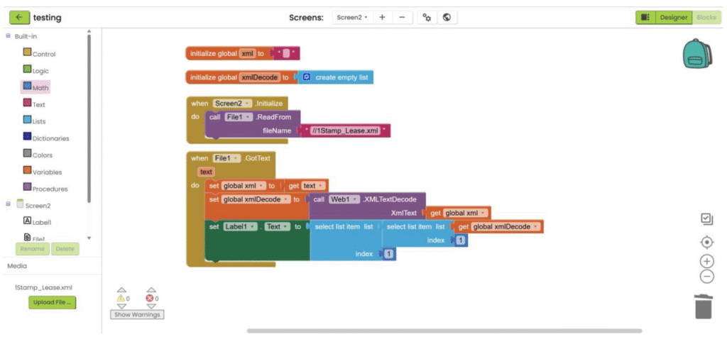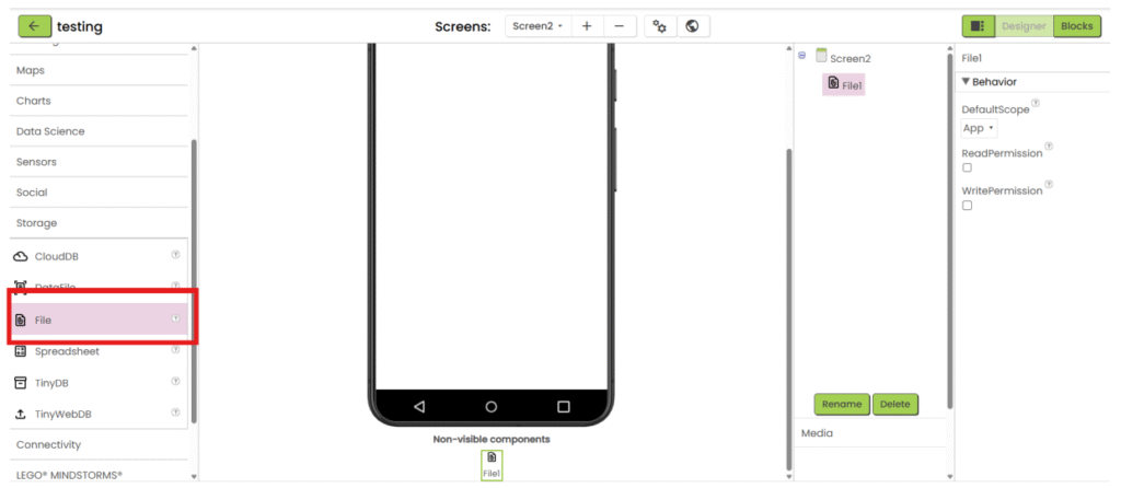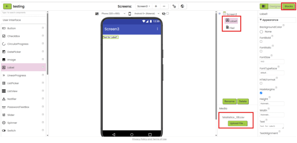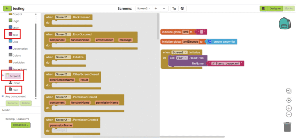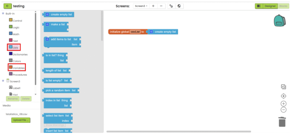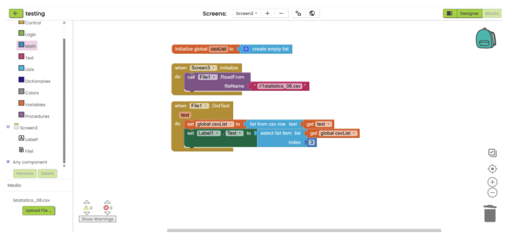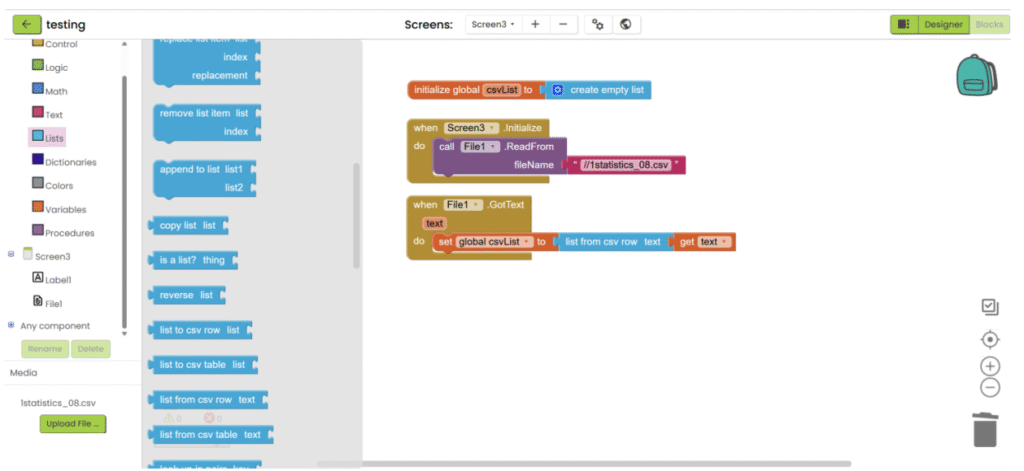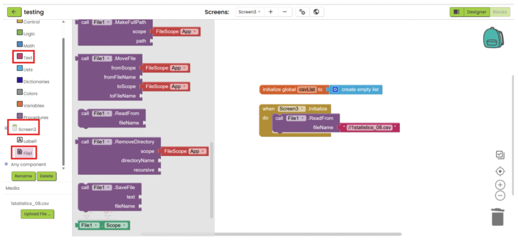1. Refer to steps 1-5 in “App inventor with XML”. Add “File” component under “Storage” category, upload the csv file and add the necessary user interface component to show the data. Then go the “Blocks”.