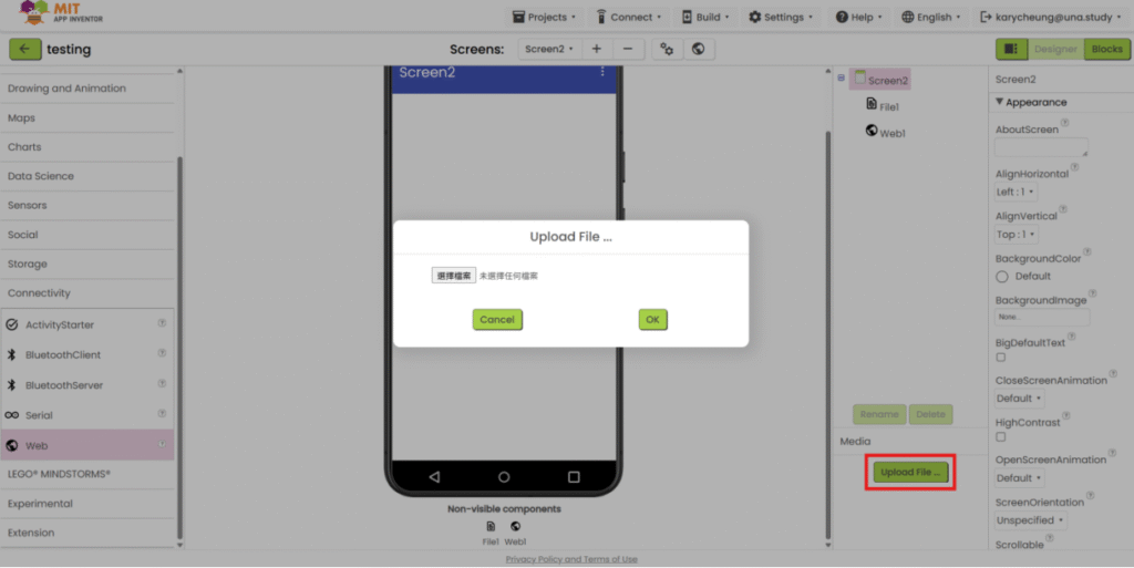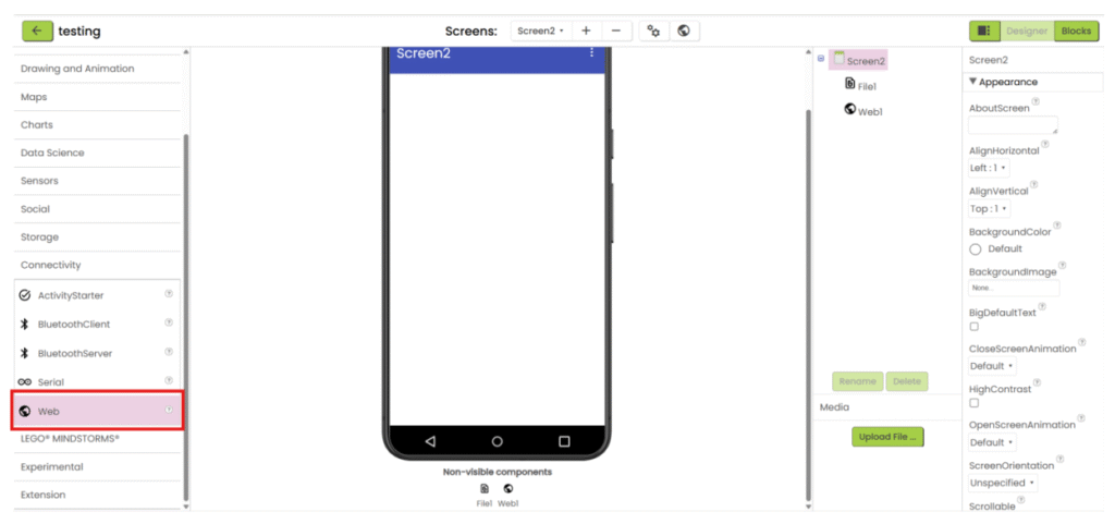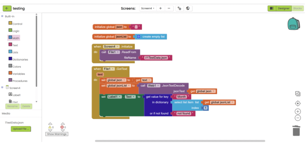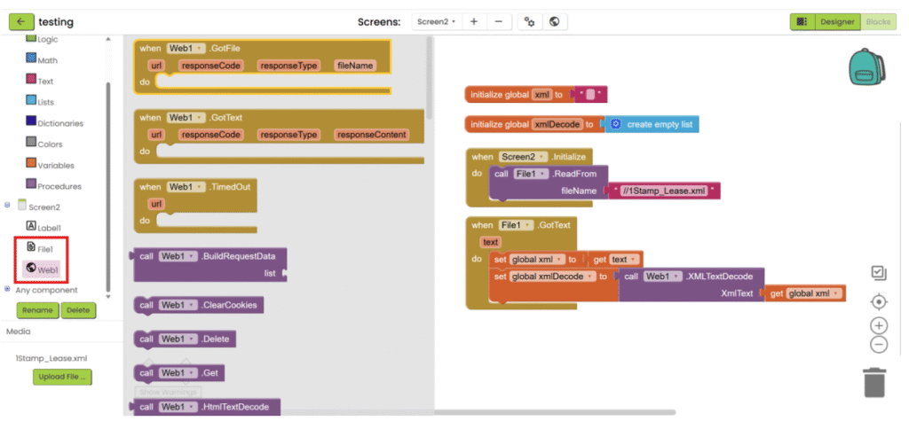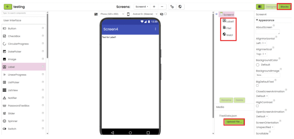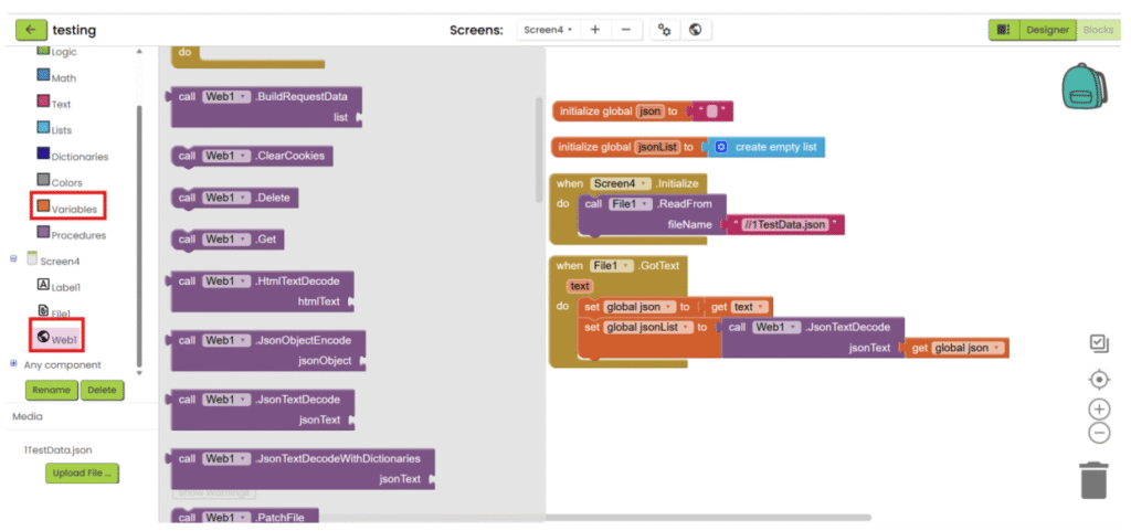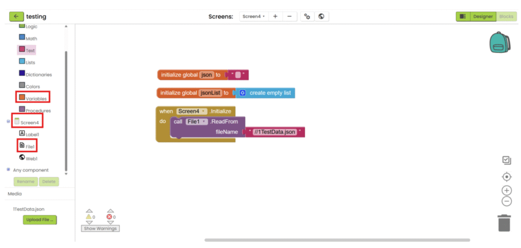 1. Refer to steps 1-5 in “App inventor with XML”. Add “File” component under “Storage” category and add “Web” component under “Connectivity” category. Upload the json file and add the necessary user interface component to show the data. Then go the “Blocks”.