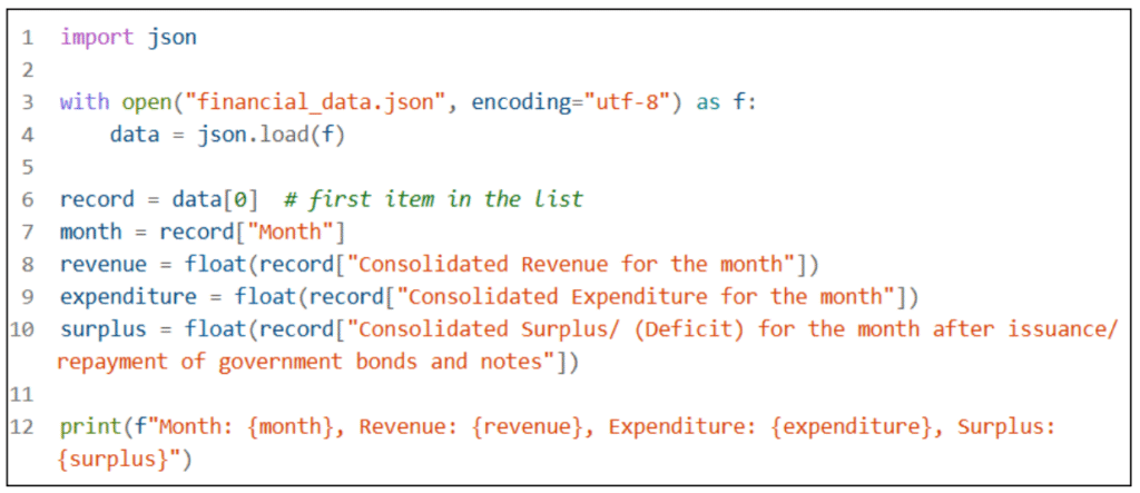 3. Create variables to hold the parsed dict/list. Read and load the file into a Python dict.