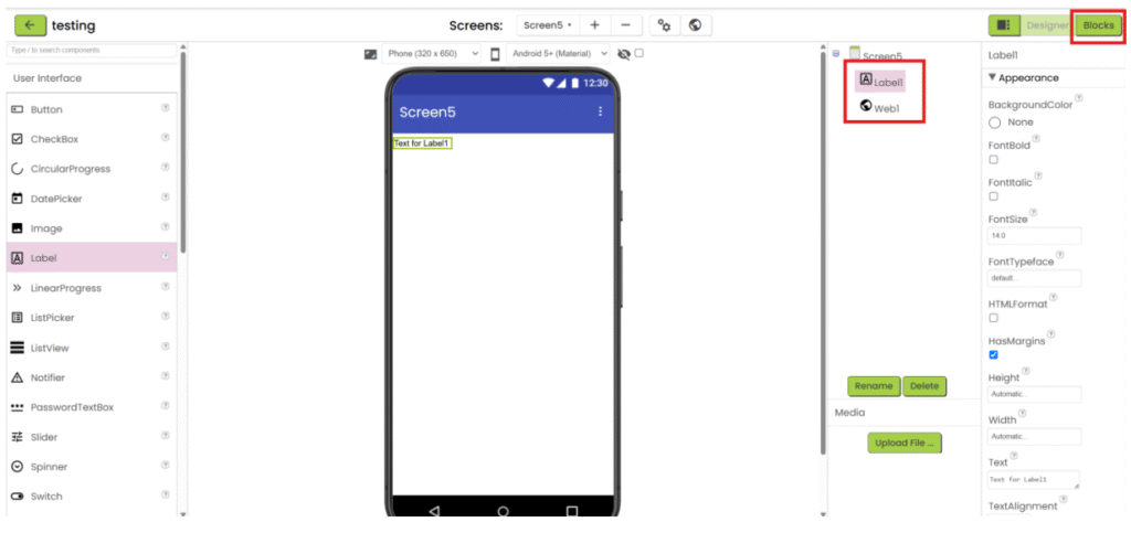 5. Add the necessary user interface component to show the data. Then go the “Blocks”.