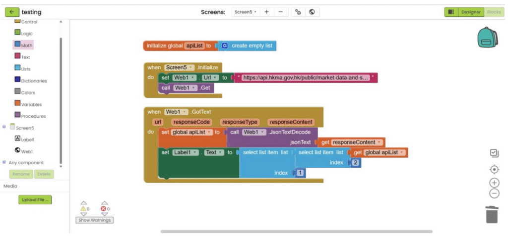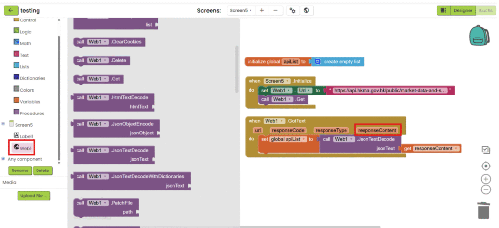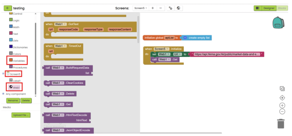 1. Refer to the steps 1-5 in “App inventor with XML”. Add “Web” component under “Connectivity” category and add the necessary user interface component to show the data. Then go the “Blocks”.