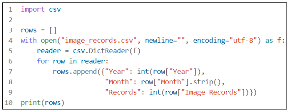 1. Use either built-in csv or pandas. (Built-in is simplest and needs no installation.)